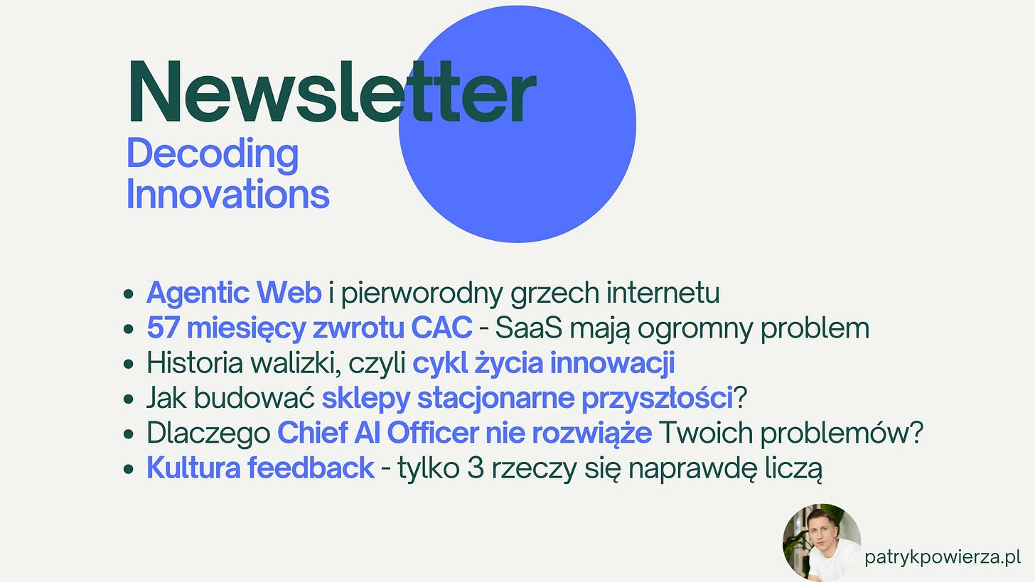 Agentic Web vs pieniądze, rosnący CAC w SaaS, cykl życia innowacji, sklepy stacjonarne przyszłości, wdrażanie AI w firmie, błędy kultury feedbacku